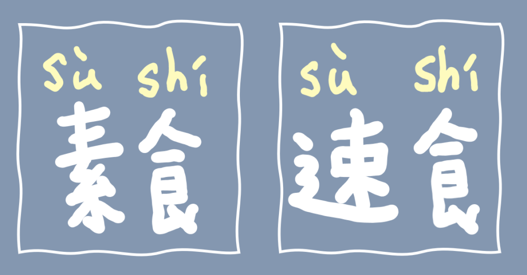 「素食」と「速食」の読み方同じですけど、意味が違うから、皆さん間違えないようにしてくださいね。