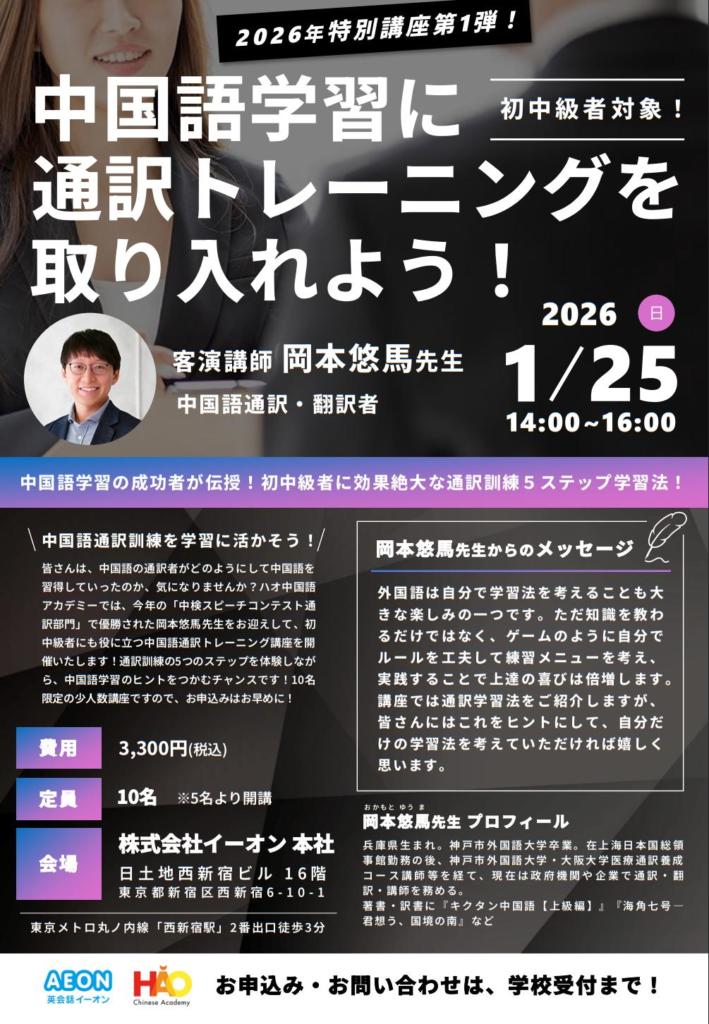 この度、ハオ中国語アカデミーでは、中国語学習者のさらなるステップアップを支援するため、初中級レベルの受講者を対象に、特別講座「中国語学習に通訳トレーニングを取り入れよう!」を実施することとなりました。