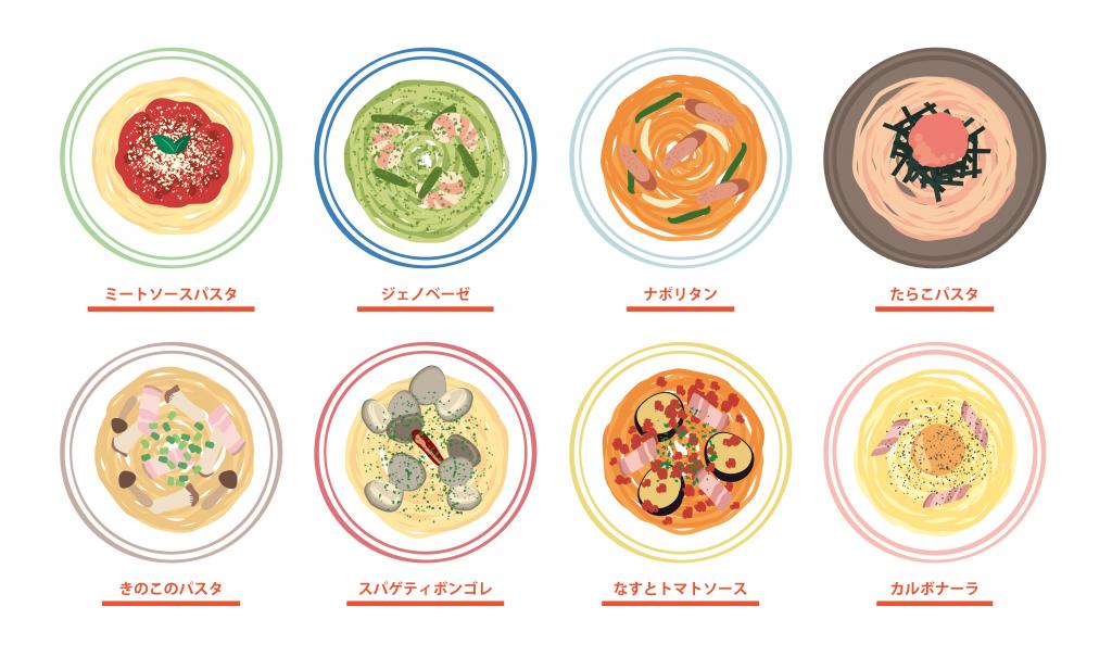 前回に続いて、イラスト二行目のパスタの中国語名をご紹介します。