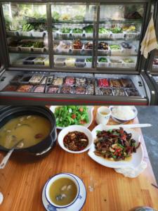 大家都是站在这样的冰箱旁边,看着食材点菜。我们点了一份乌鸡汤,一份炒蔬菜,一份炒蘑菇。一盘菜真的太多了,吃不完。。。。。。老板娘说鸡汤喝不完可以帮我们保存起来,晚上再来喝。真是太热情了!