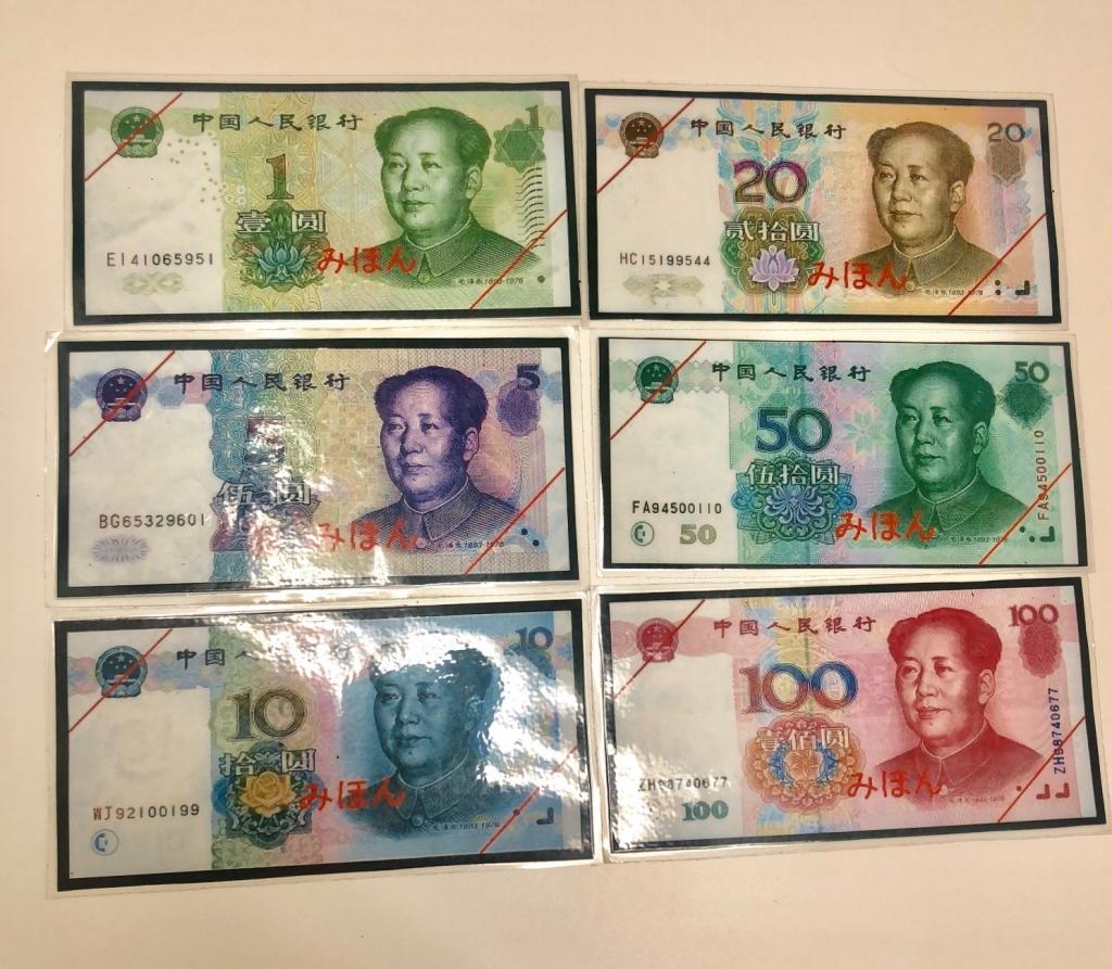 表にある肖像画は全て毛沢東で、緑、紫、青、茶、青緑、赤と額面によって紙幣の色が違います。