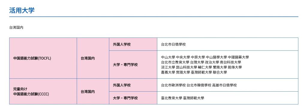 現在、台湾国内の多くの専門学校、大学や大学院が本検定試験を入学申請条件、
