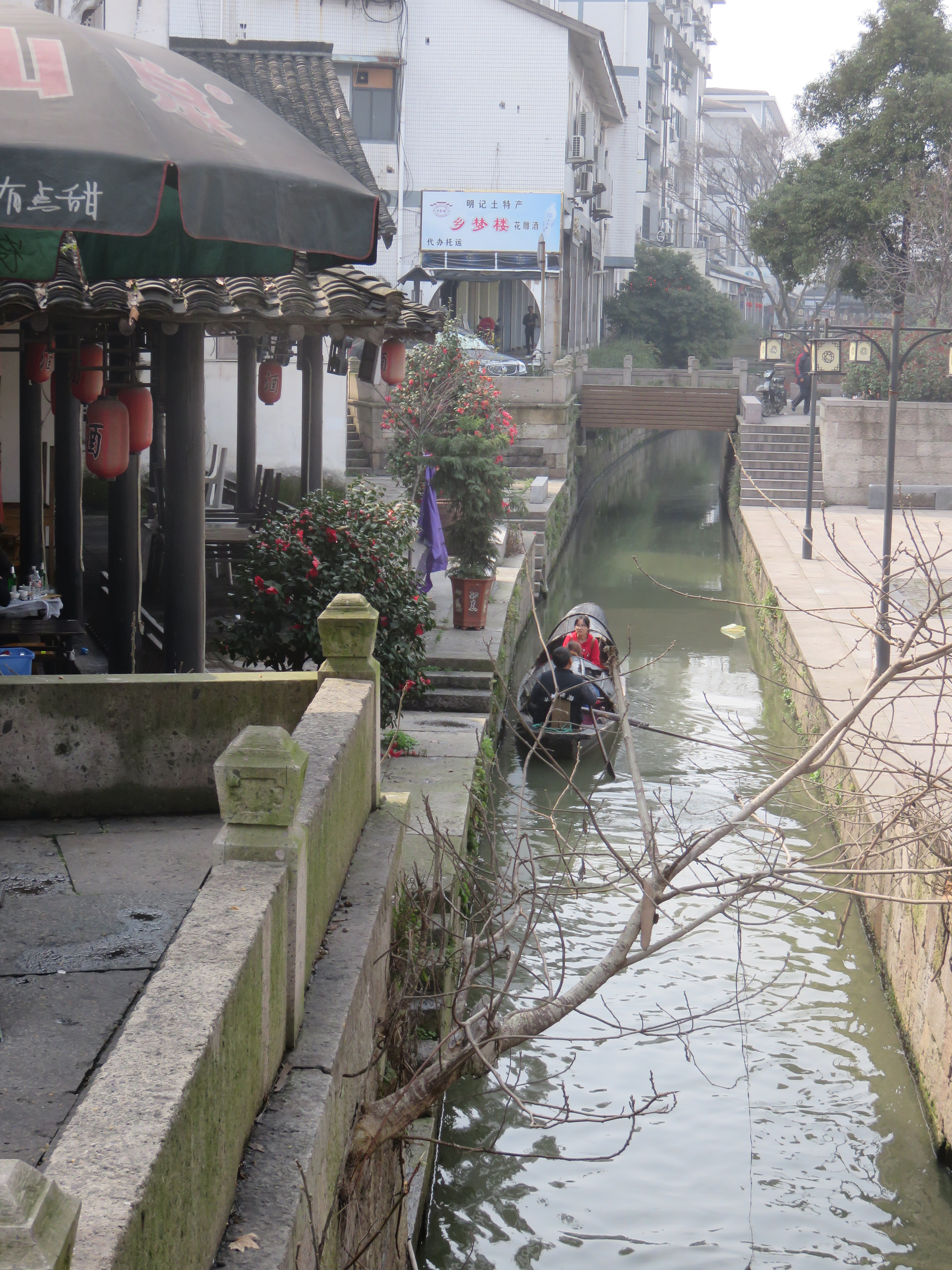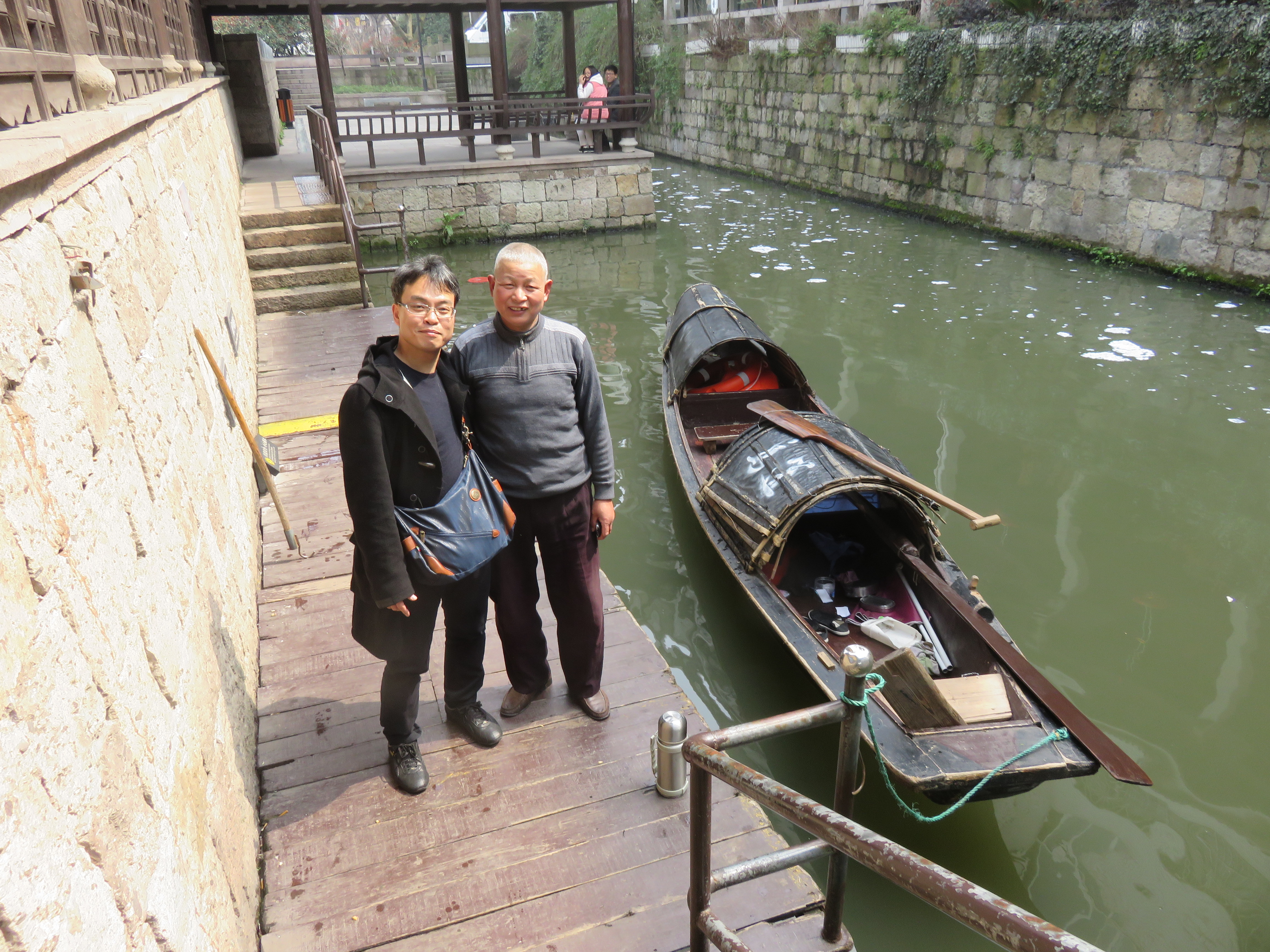 我们现在鲁迅故居附近逛了逛,然后坐小船享受运河上看到的风景。小船随着波浪悠悠荡荡,让我们悠闲又自在。老师傅一边用手一边用脚划着小船,他的技术很不错。他主动跟我们说起话来,所以我很享受与他的聊天儿。他说他现在六十多岁,可是已经划了五十年的小船。他一边划船,一边给我们介绍运河附近的事情。比如应该看看哪里,应该在哪里吃饭,哪里可以买到很好喝的绍兴酒等等。跟他聊天儿的时候,我看见在运河岸边用运河水洗衣服的女人。运河的水在我看来不很干净,不适合洗衣服。看着我们吃惊的表情,老师傅说这条河附近的人常常用运河水洗衣服。他继续说:衣服脏的时候,先用运河水洗过后,回家再用洗衣机洗。他说话的口音很重,所以很多地方我没听懂,也许有不少地方我听错了。但是我感觉跟老师傅沟通还是没有问题的。我相信他也在享受与我们的聊天儿,他的笑容表达出的内容远远多于语言。