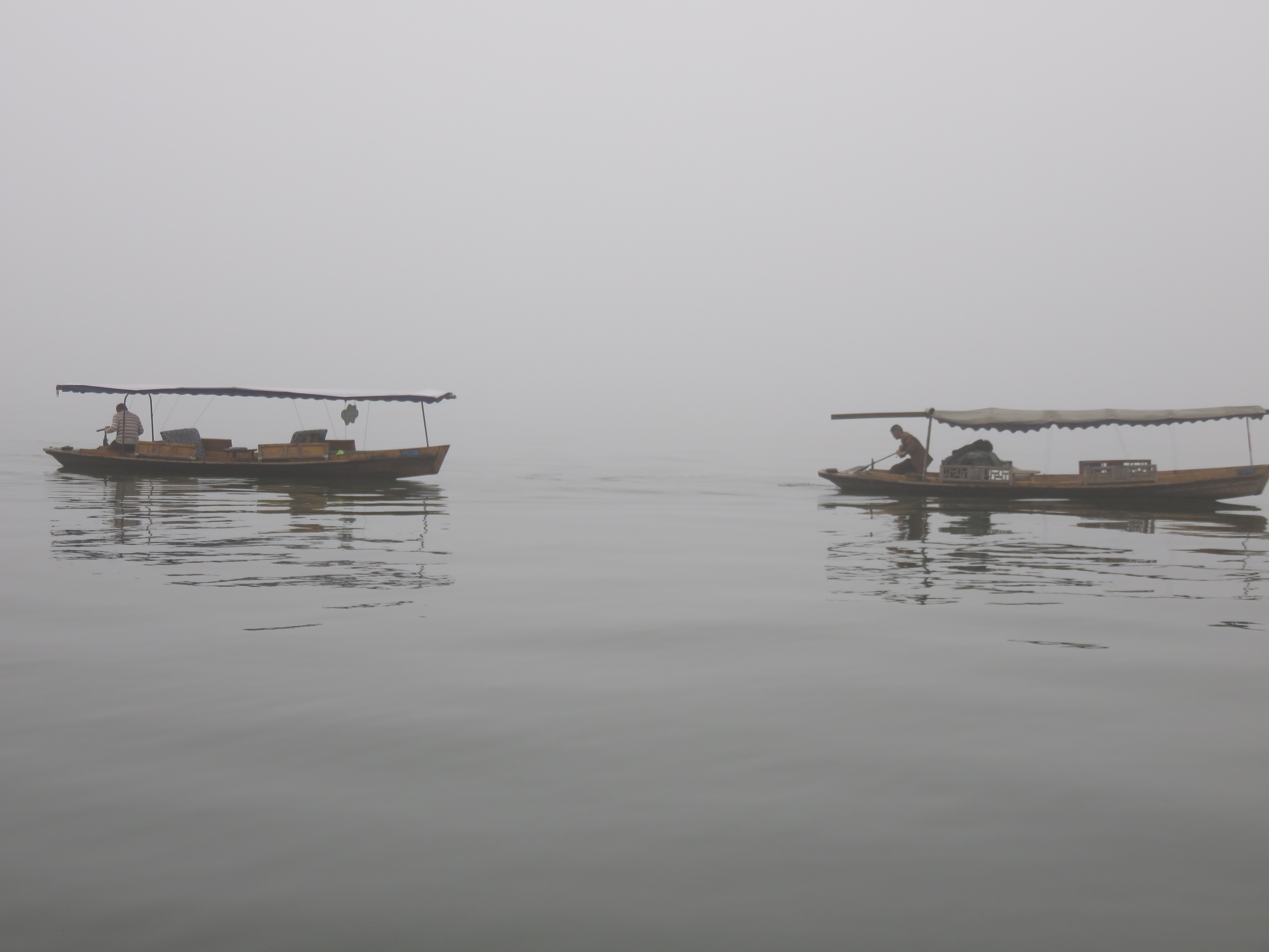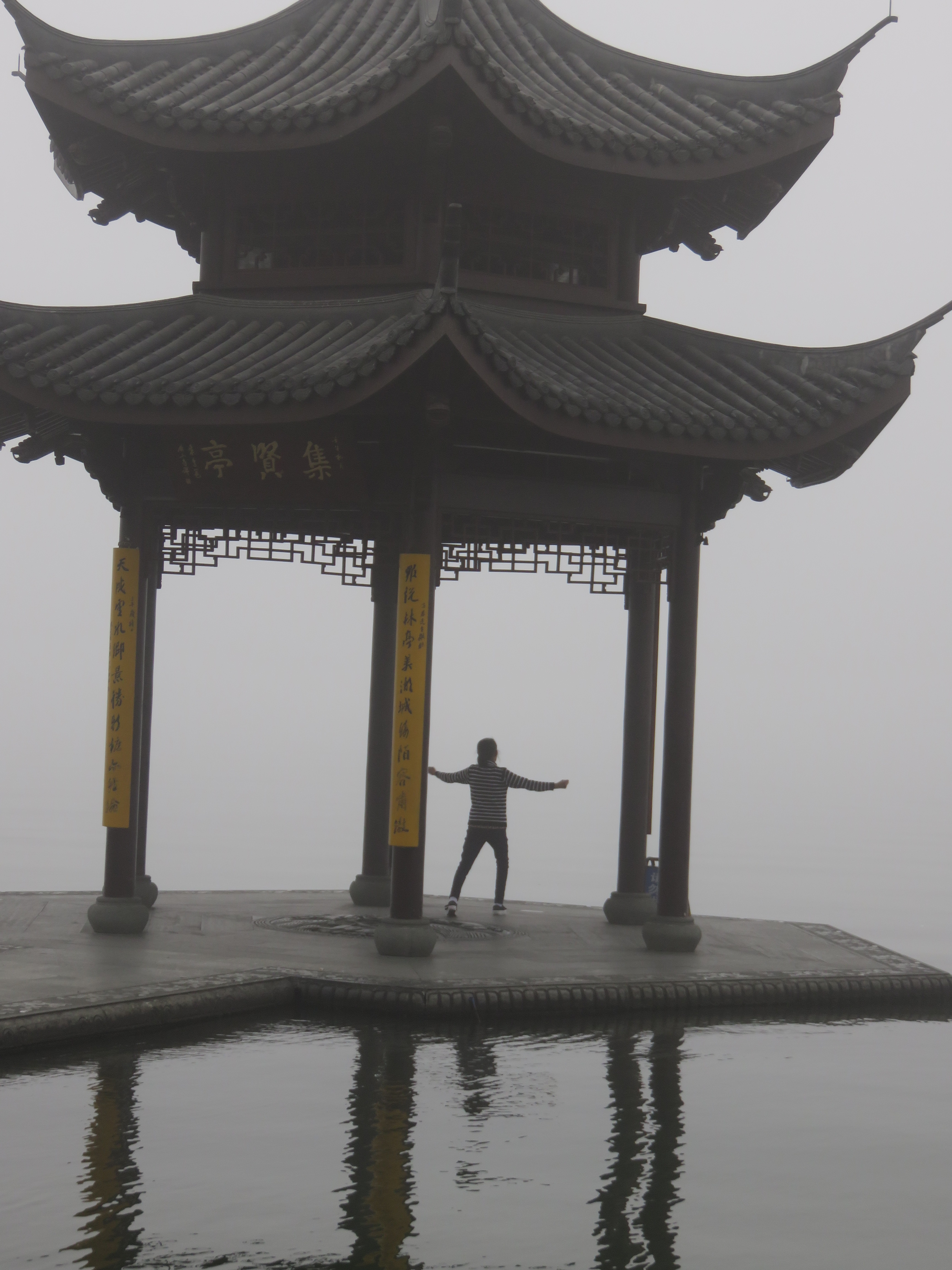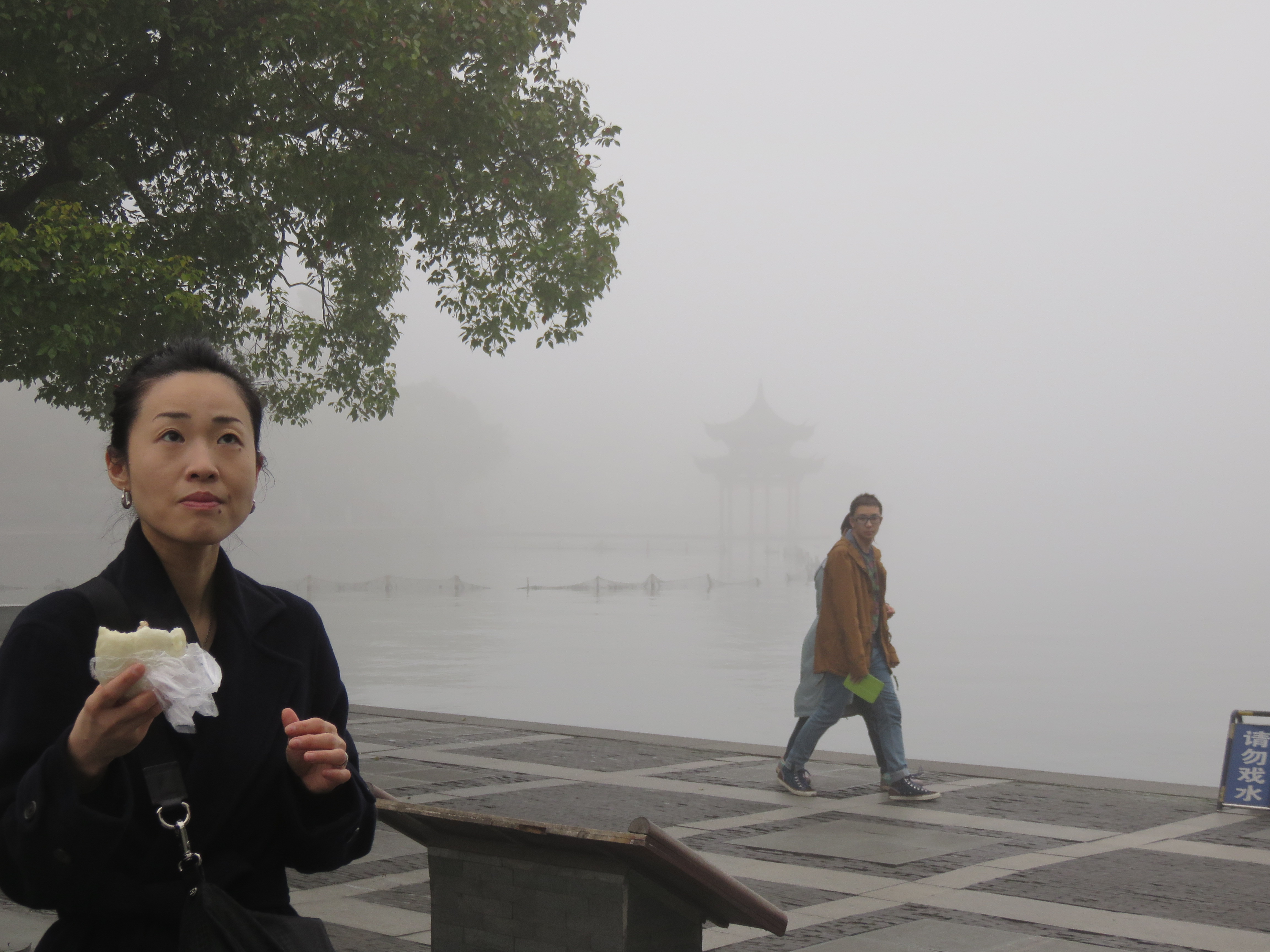 杭州的气候跟东京很像。对我们来自东京来的人来讲,杭州的湿度和温度很容易适应。走路几分钟,穿过排满名牌商店的马路,弥漫着浓雾的雾茫茫的西湖,出现在我们的眼前。我终于看到了被白居易等历代文人墨客赞颂过的旅游胜地……西湖。我突然想起了苏东坡的名诗《饮湖上初晴后雨》: