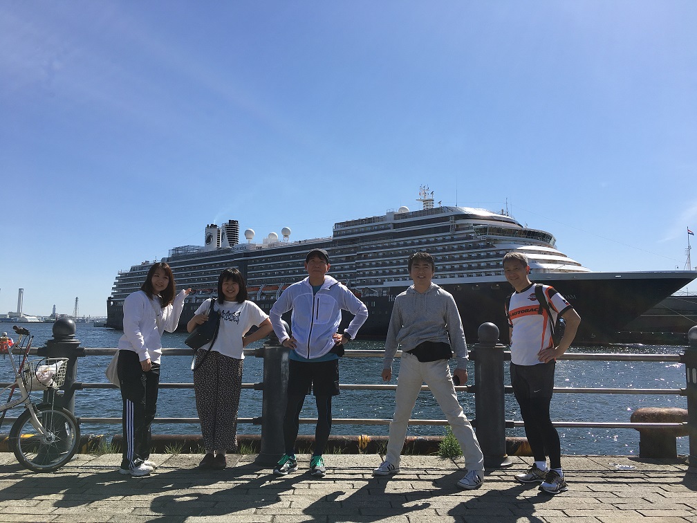 (豪華旅客船の前でポーズ!いい天気に恵まれて、皆テンションが高いです。)