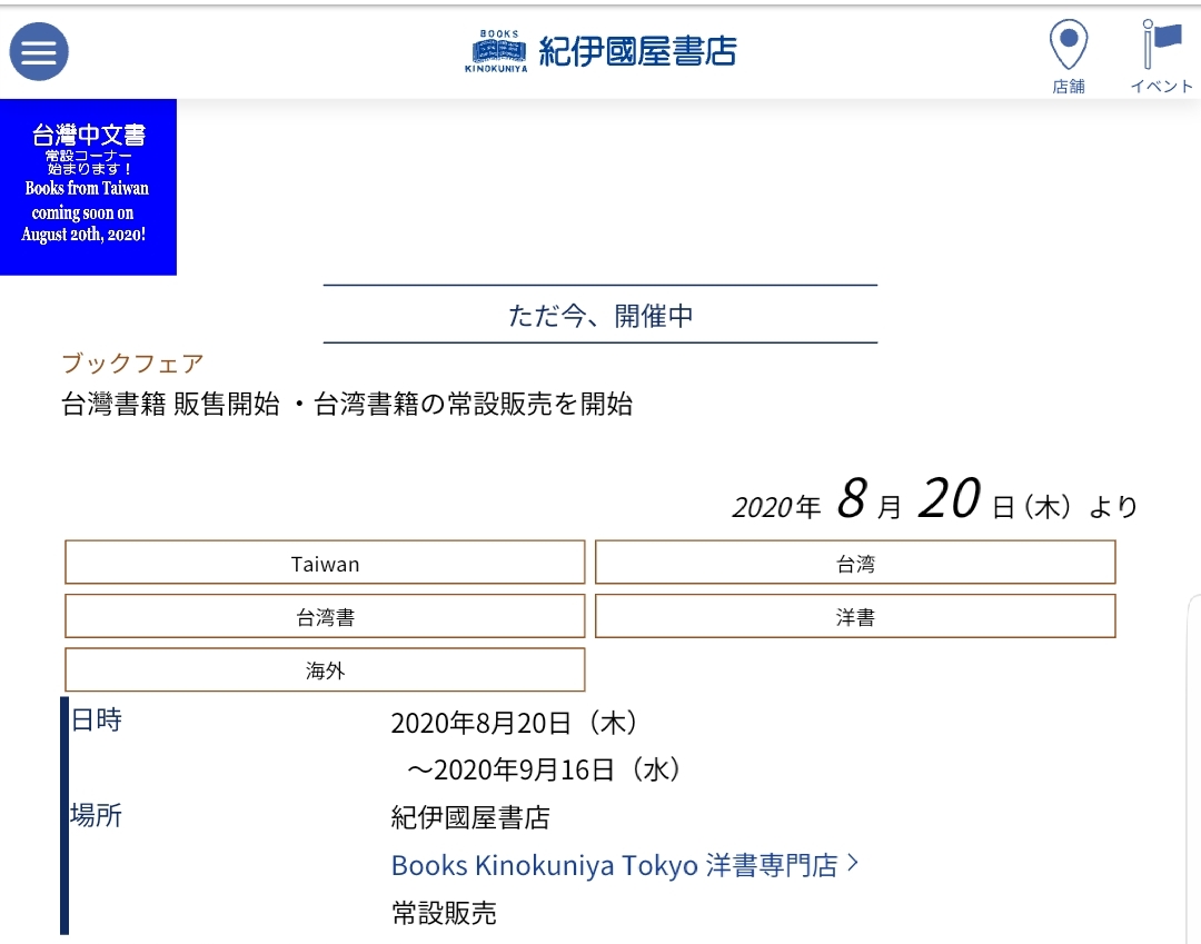Books Kinokuniya Tokyoでは、2020年夏より台湾書籍の常設を開始致します。