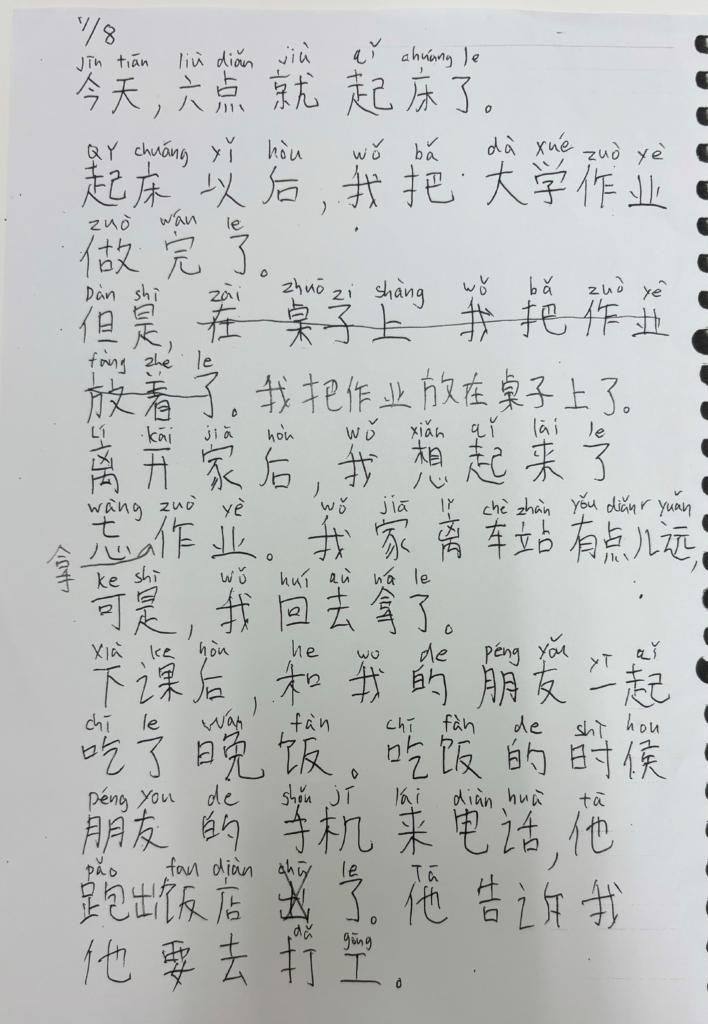 今天,六点就起床了。起床以后,我把大学作业做完了。但是,我把作业放在桌子上了。离开家后,我想起来了忘拿作业。我家里车站有点儿远,可是,我回去拿了。