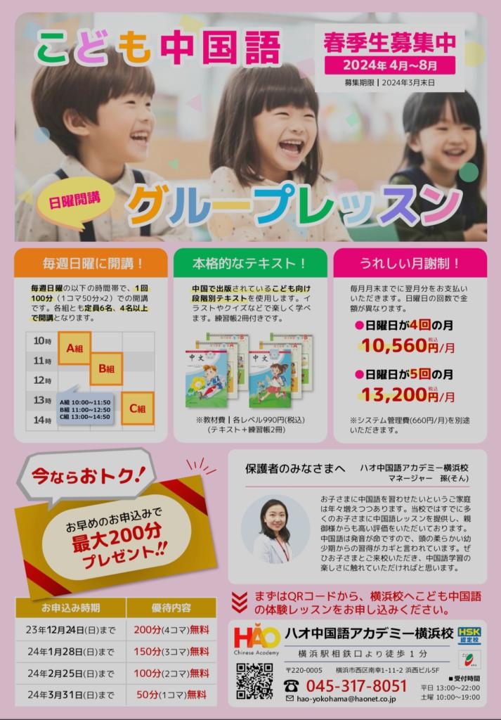 ハオ中国語アカデミー横浜校では、2024年4月からの春季生を募集しています。