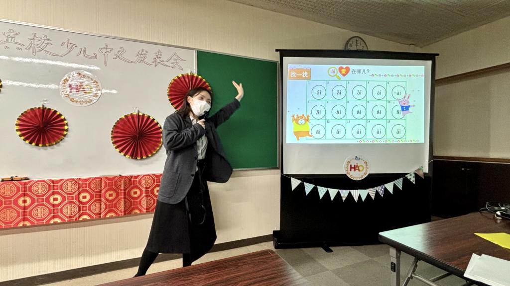 そして、横浜校では年に2回「こども中国語発表会」を開催しています。発表会の数ヶ月前からレッスン中またはレッスン後に先生と一緒に練習をしていて、発表会のときうまくその練習の成果を上げたら、子供たちが日々の努力は成功とつながっていることを思いますし、自信が身についたらこれからの勉強にもきっと有利だと思います。