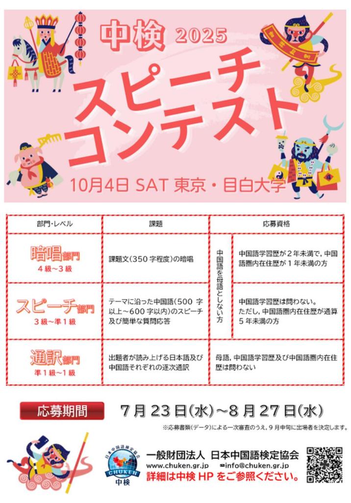 | 参加資格 | 中国語学習者 ※詳細は中検の公式HPにてご確認ください |