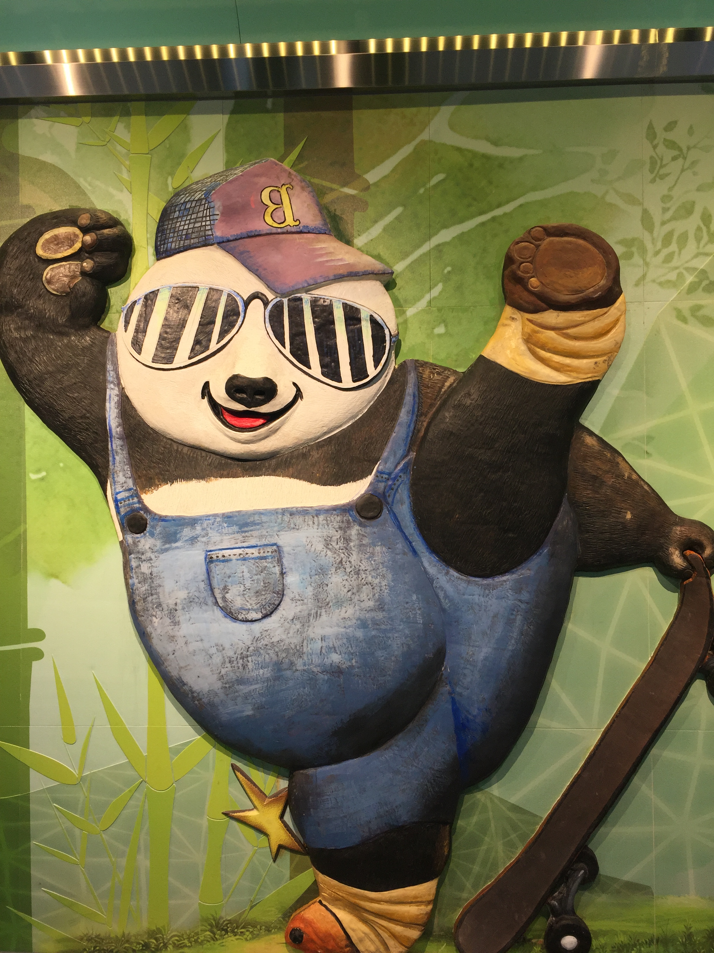熊猫大街站里有很多3D熊猫壁画。很多游客在这里拍照。
