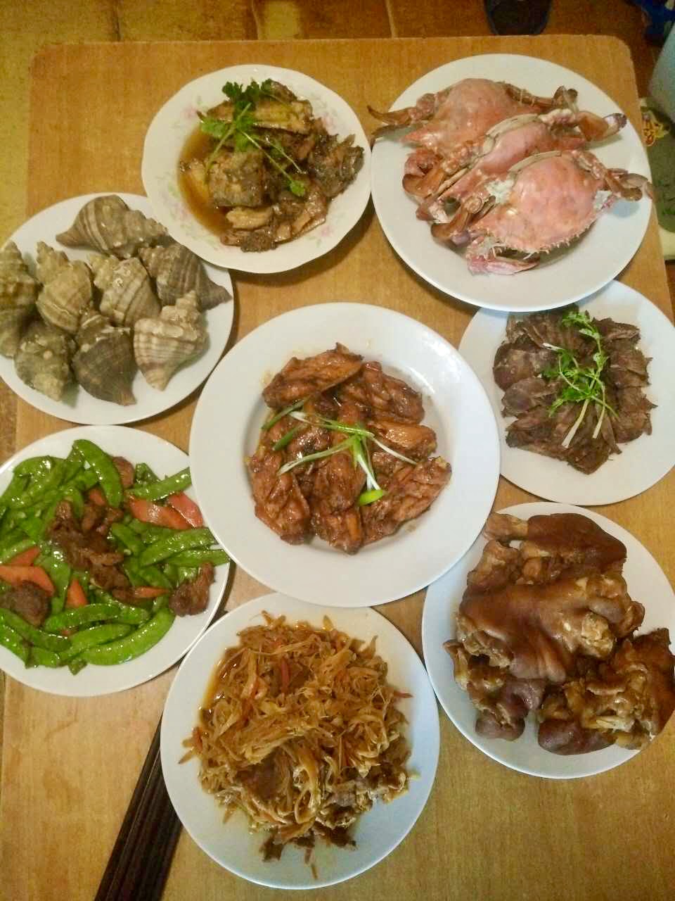 別の日の食卓…カニや豚足、シャコが並んでいます。