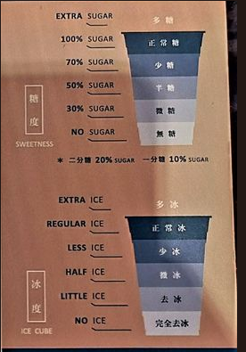 到手搖飲料店點飲料的時候,店員會問你甜度、冰塊要不要調整,你可以選擇: