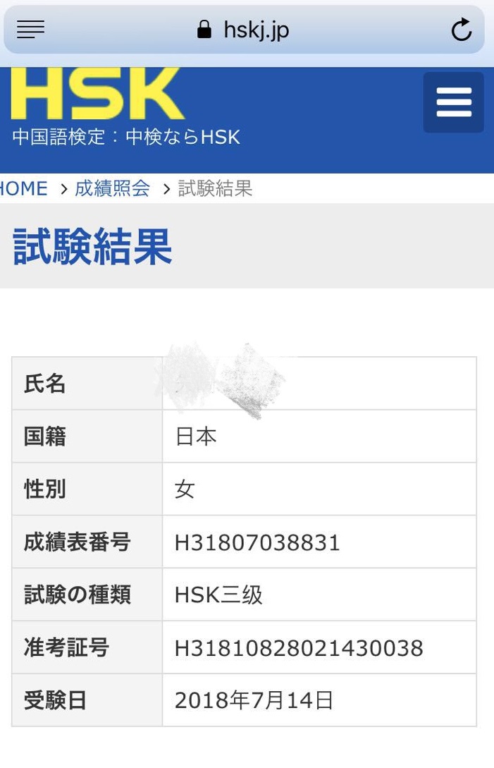 S.Q様が今年7月のHSK3級試験で高得点を取りました!